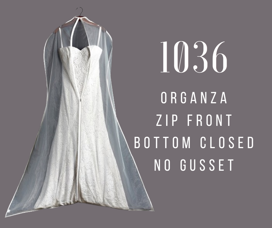 Organza Zip Front, Bottom Closed. Pack of 10 Sheer Organza Gown Covers for dress protection without the static electricity of standard plastic zip covers! Top opening for hangers and zip front for easy removal! Organza covers are ideal for dresses with heavy beading and rhinestone settings!