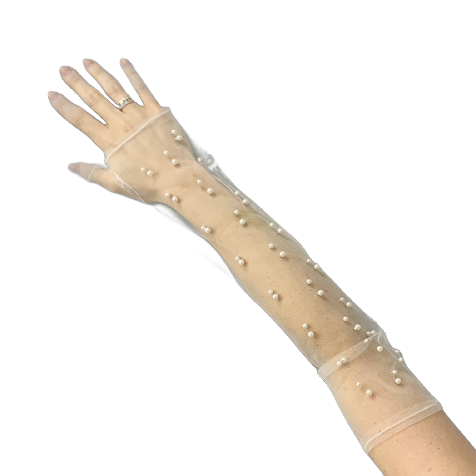 Ivory pearled fingerless gloves. One Size. These gloves have stretch and can accommodate up to an avg sz. 14 Bride depending on arm size!