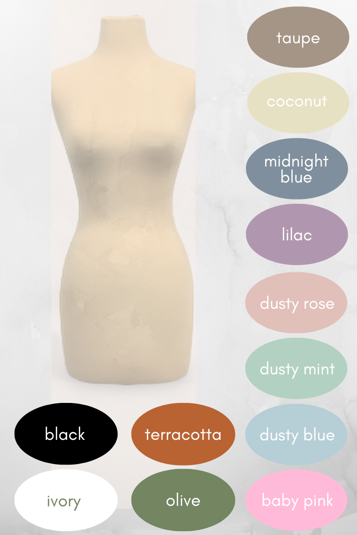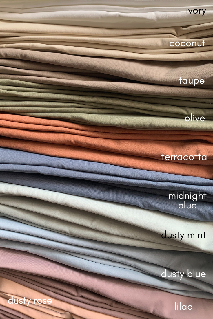 Ivory, Black, Terracotta, Olive, Taupe, Coconut, Midnight Blue, Lilac, Dusty Rose, Dusty Mint, Dusty Blue, Baby Pink