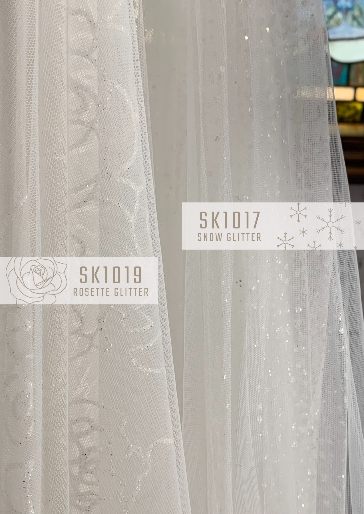 SK1017 – 2 Layer skirt. Top layer soft Ivory tulle over bottom layer SNOW Glitter Tulle layer. ¼” rolled waistband with metal hooks for attaching to dress. Opening in back for easy try-on with metal hook and eye/clear snap closures in back.