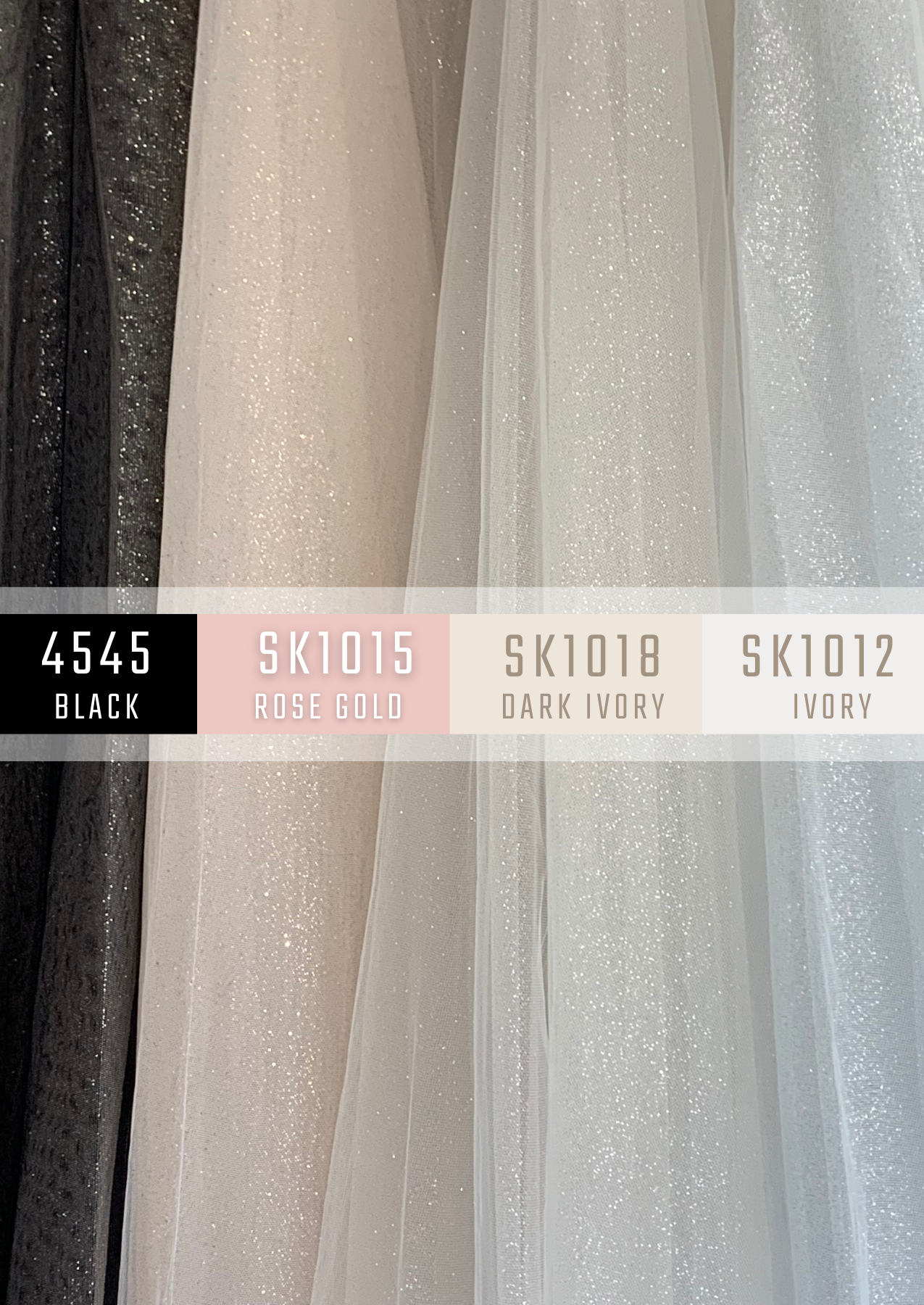 4545HS (Rose Gold) – 2 Layer half skirt. Top layer soft Black tulle over bottom layer Rose gold Tulle w/ Rose gold Glitter layer. ¼” rolled waistband with metal hooks for attaching to dress. Easy try-on with metal hook and eyes. (note box pleats)